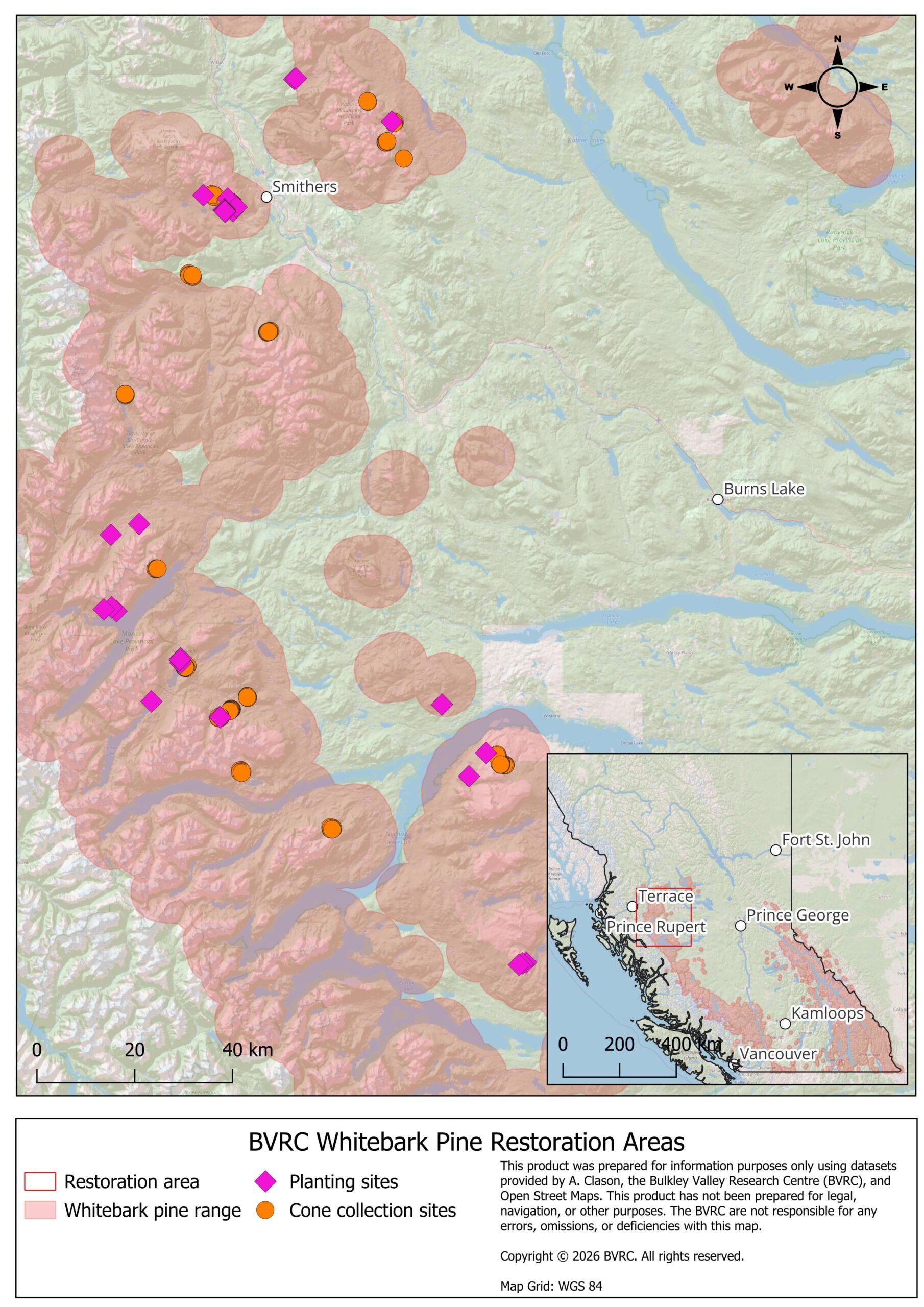 In 2011, the BVRC began a collaborative project to restore whitebark pine ecosystems in west central British Columbia near the communities of Smithers and Houston. The program has now expanded across northern BC, with emphasis on the Skeena Region. We focus on areas recently disturbed by wildfires, mountain pine beetle, or salvage logging of beetle-killed lodgepole pine. Most restoration plantings are located in areas of high value grizzly and black bear habitat, where the seeds can form an important part of the bears’ diet.