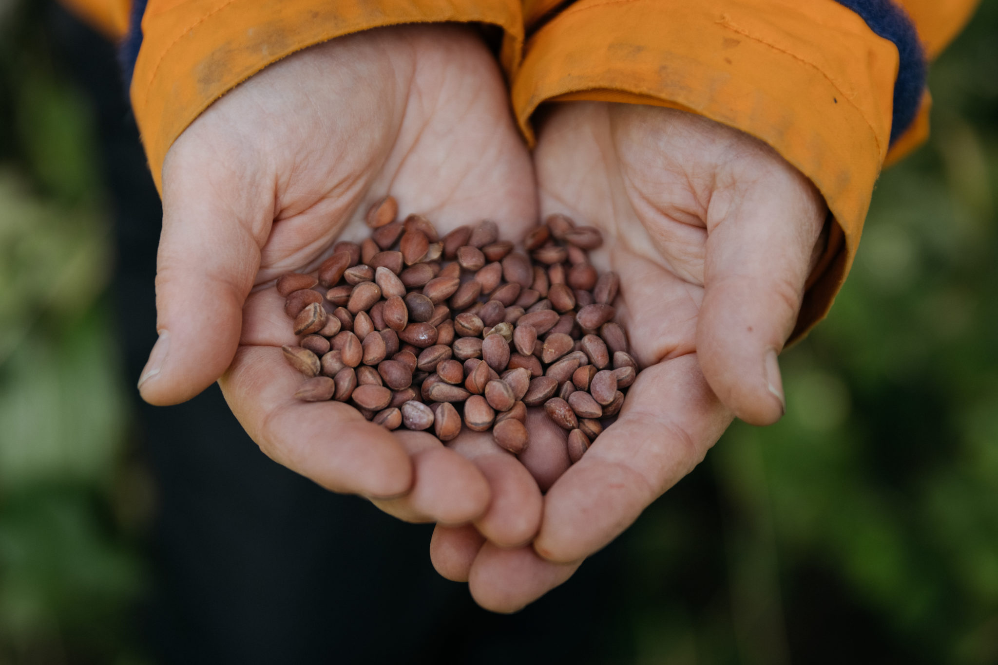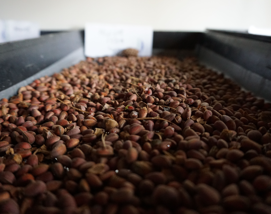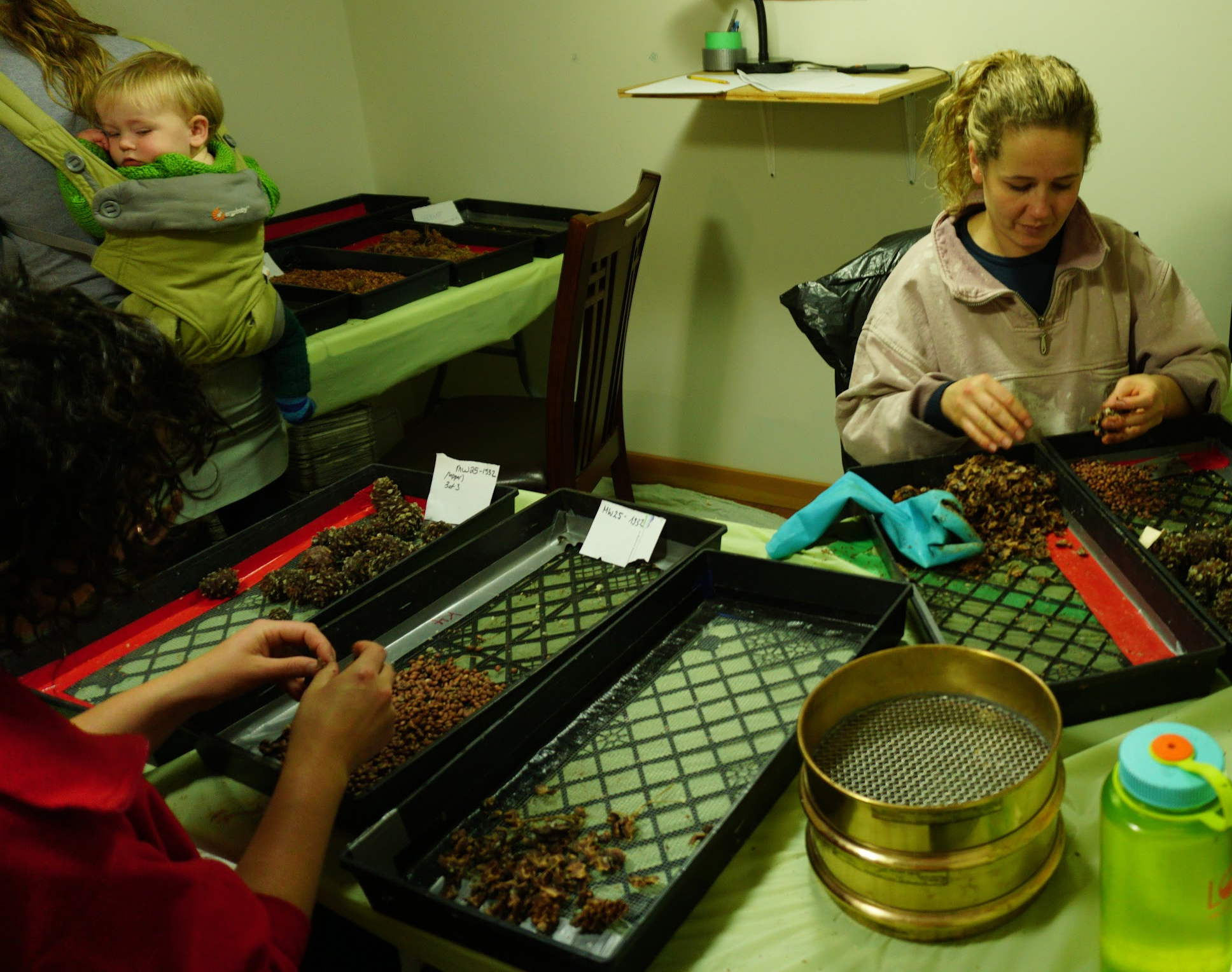 Once the cones have dried, we gather the crew to begin shucking. Great care is taken to ensure that every seed can be traced back to its parent tree.